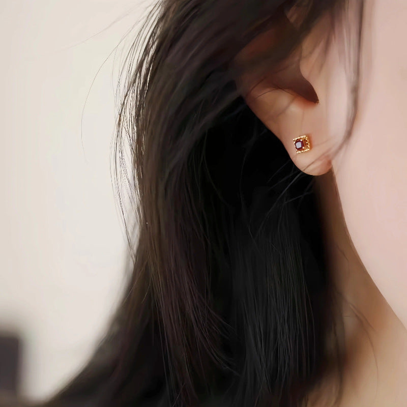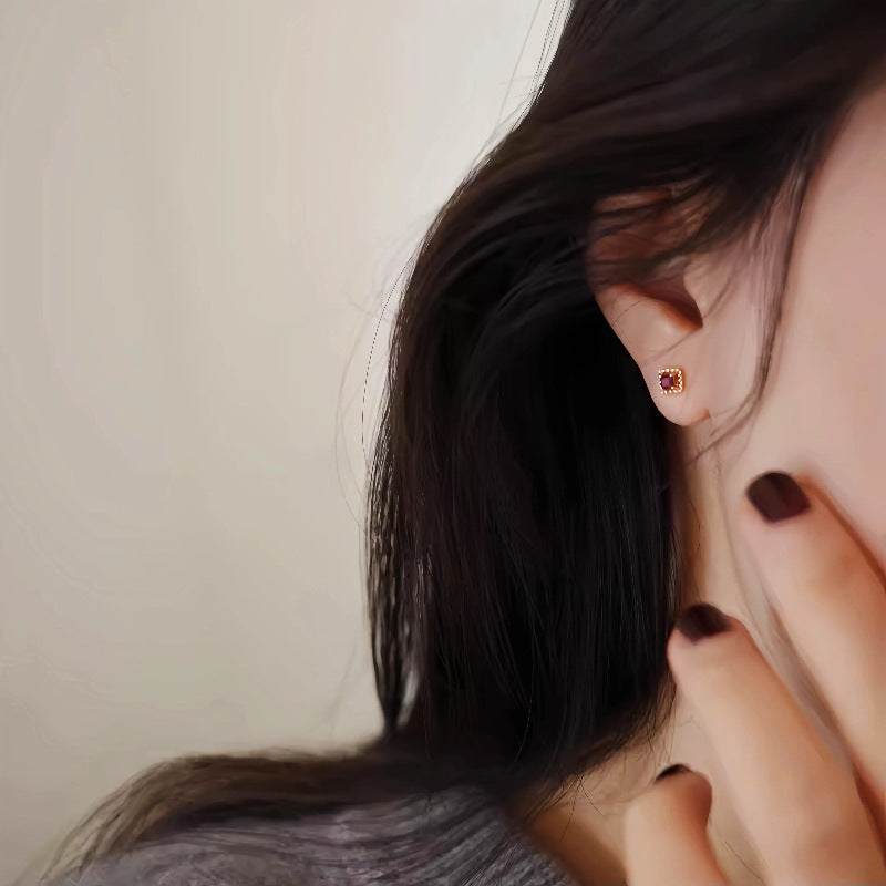 S925 Sterling Silver Plated 14K Gold Micro Inlaid Small Zirconia Ruby Stud Earrings