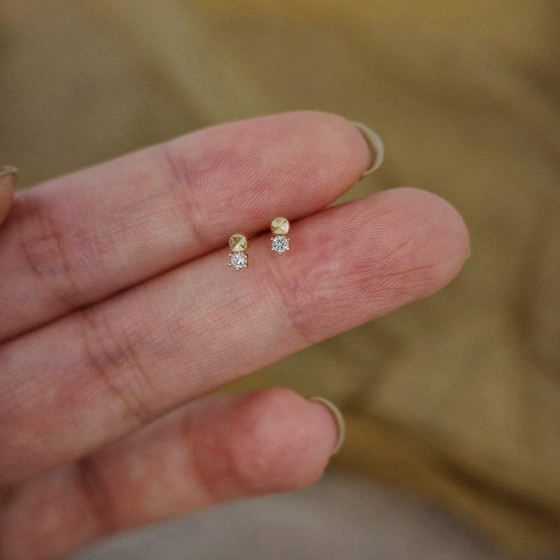 These S925 silver plated stud earrings feature a delicate 14K gold finish and showcase mini faceted zircon stones for subtle brilliance. Designed with an invisible setting, they offer a refined and elegant look that complements any outfit. Their compact size ensures comfortable wear, making them a versatile addition to any jewelry collection.